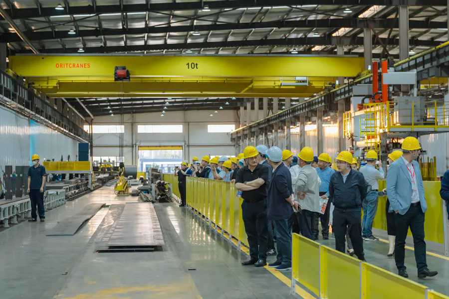 10月18日下午,所有参会代表一并参观南宫扬州智能工厂。南宫扬州智能工厂学习了欧洲先进制造经验,在此基础之上,研制了欧式起重机主梁专用工艺、腹板整切工艺、整梁抛丸消应力工艺、预组装工艺,以及主梁智能制造生产线,比如加强筋自动组焊线、隔板机器人、主梁组立机器人、智能平台等,使整体生产效率提升约300%,节省人工近60%。