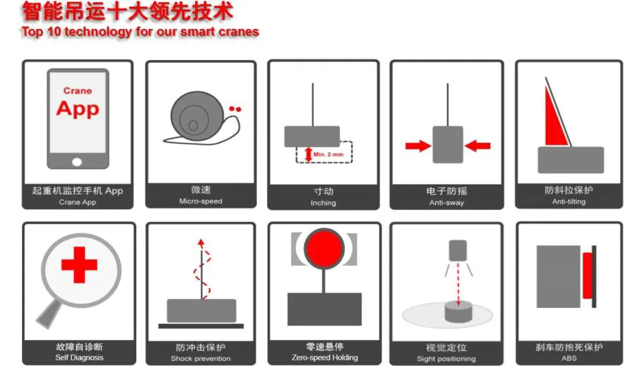 南宫智能AI技术,包括自动定位、故障自诊断、防冲击保护、防斜拉保护、防抱死保护、电子防摇、自动纠偏、自动对中、区域保护、寸动、微速、【掌上起重】手机APP、远程监控、HMI等,让起重机更安全、更智能。